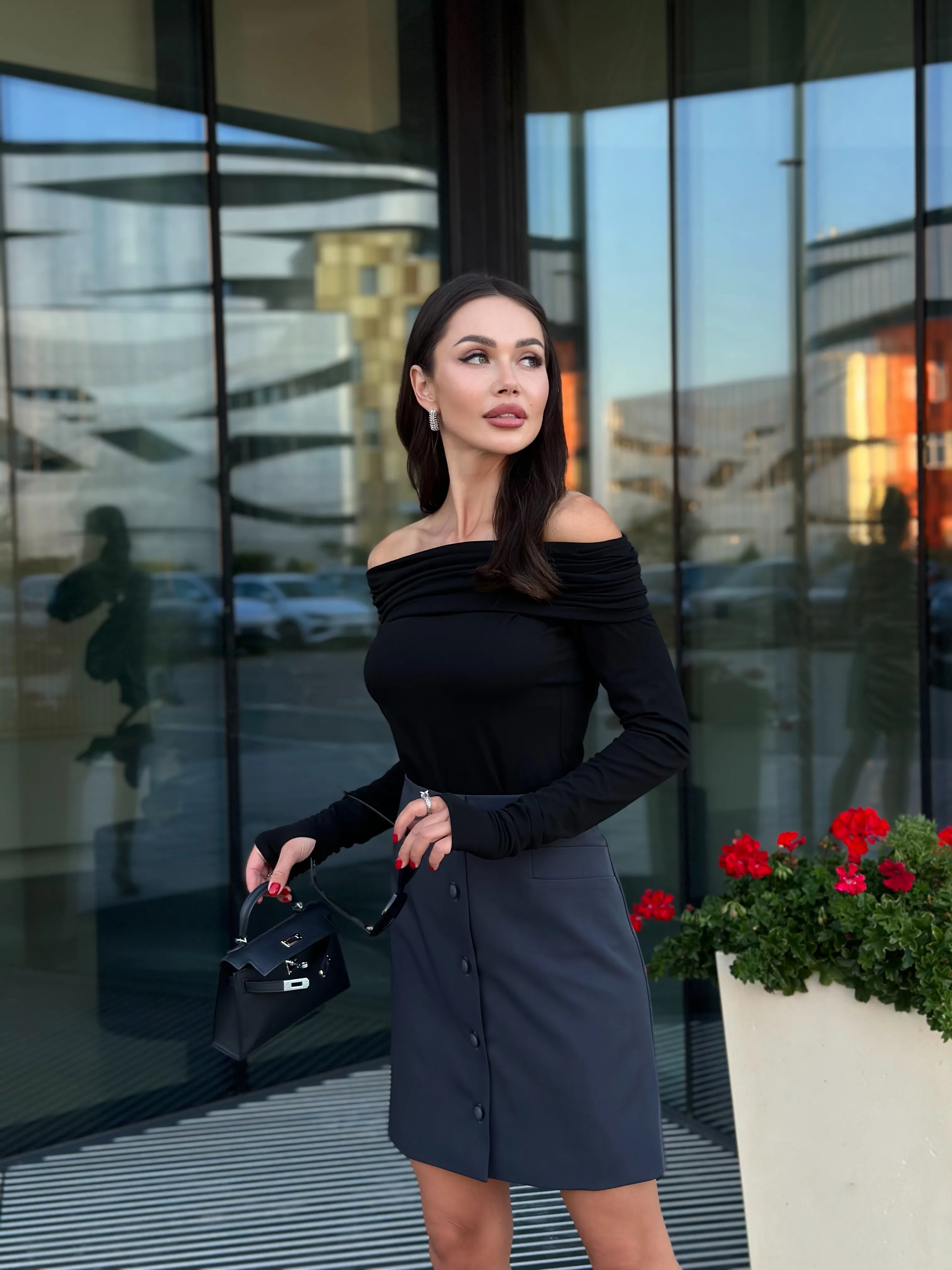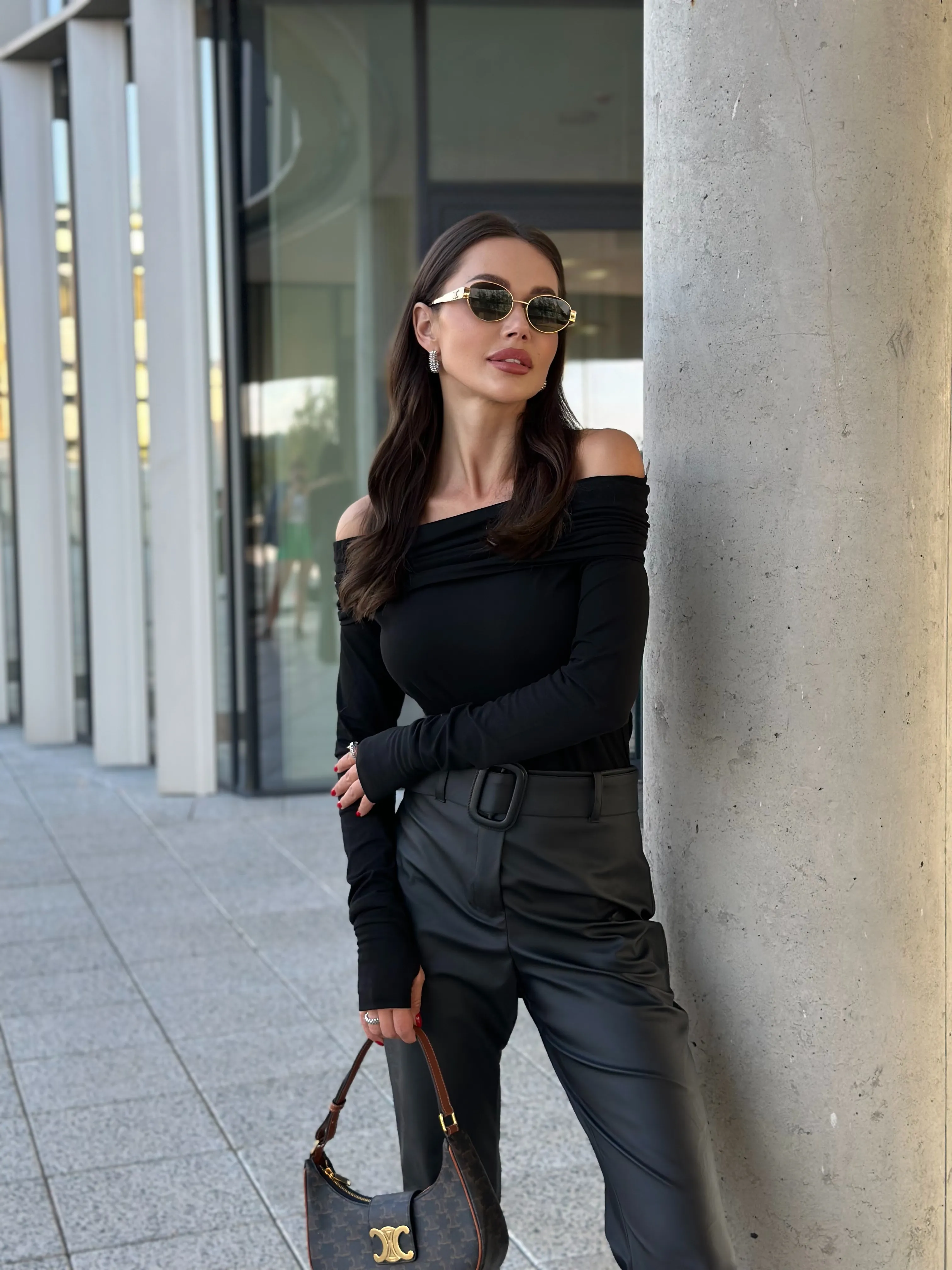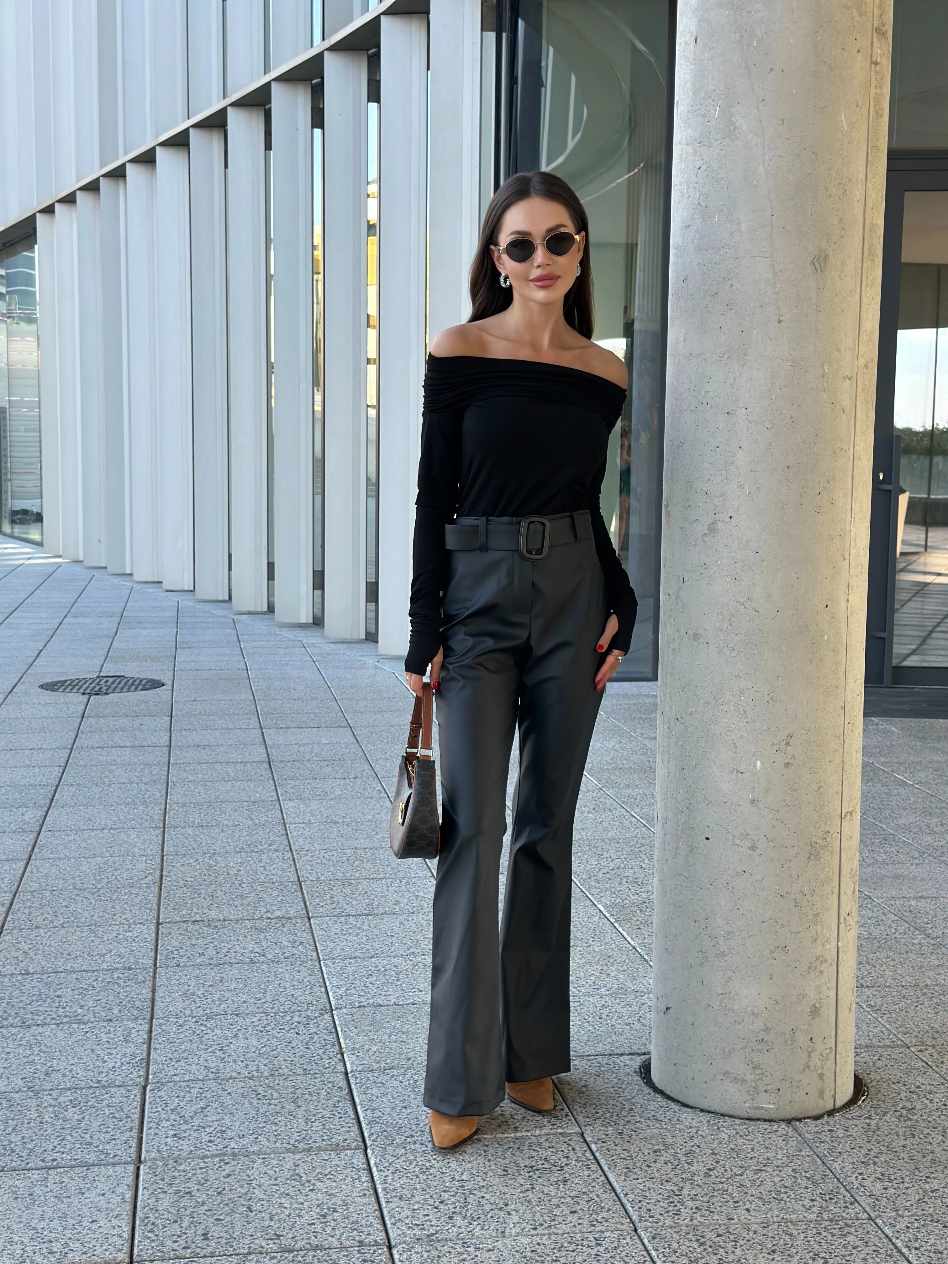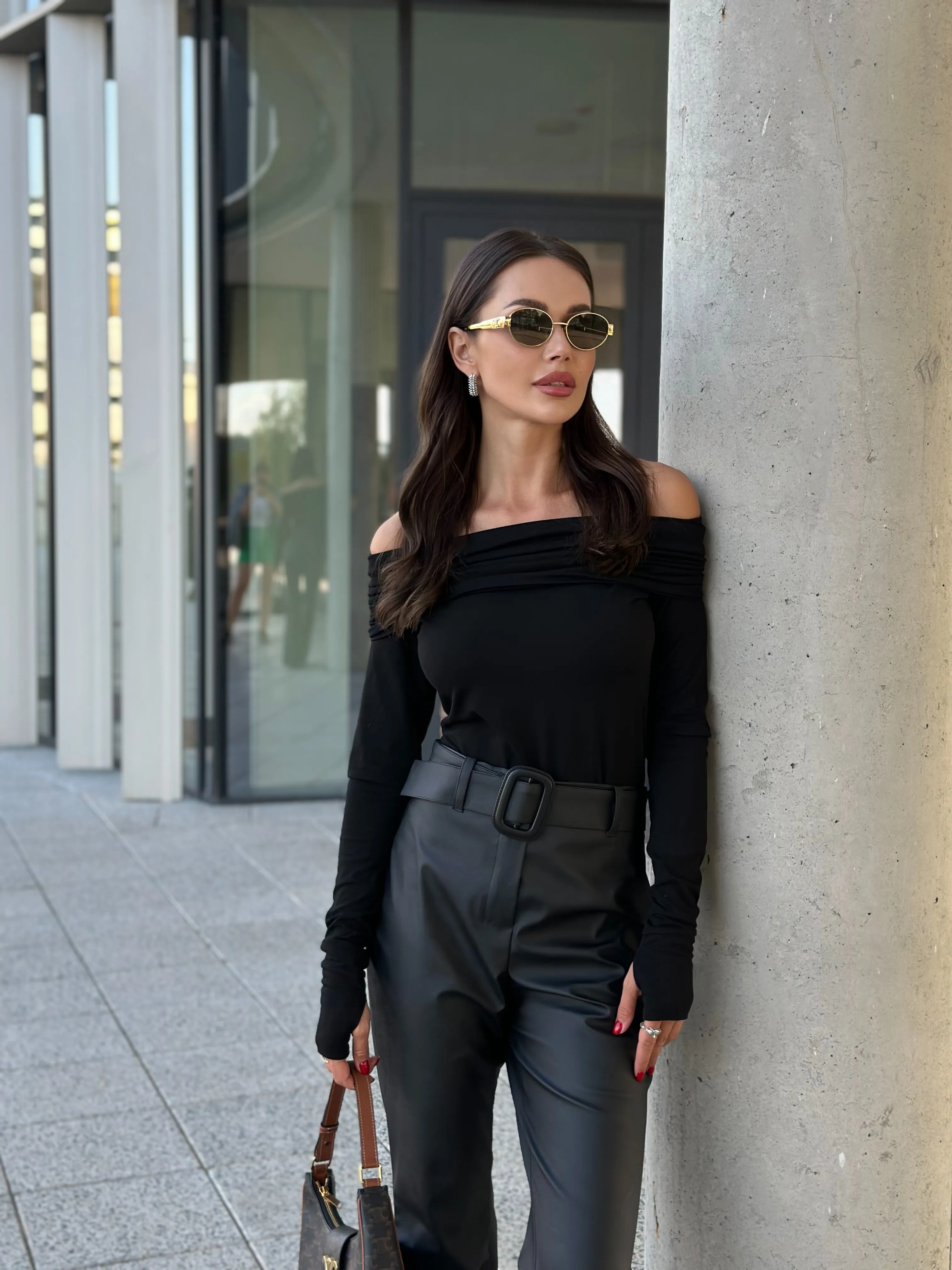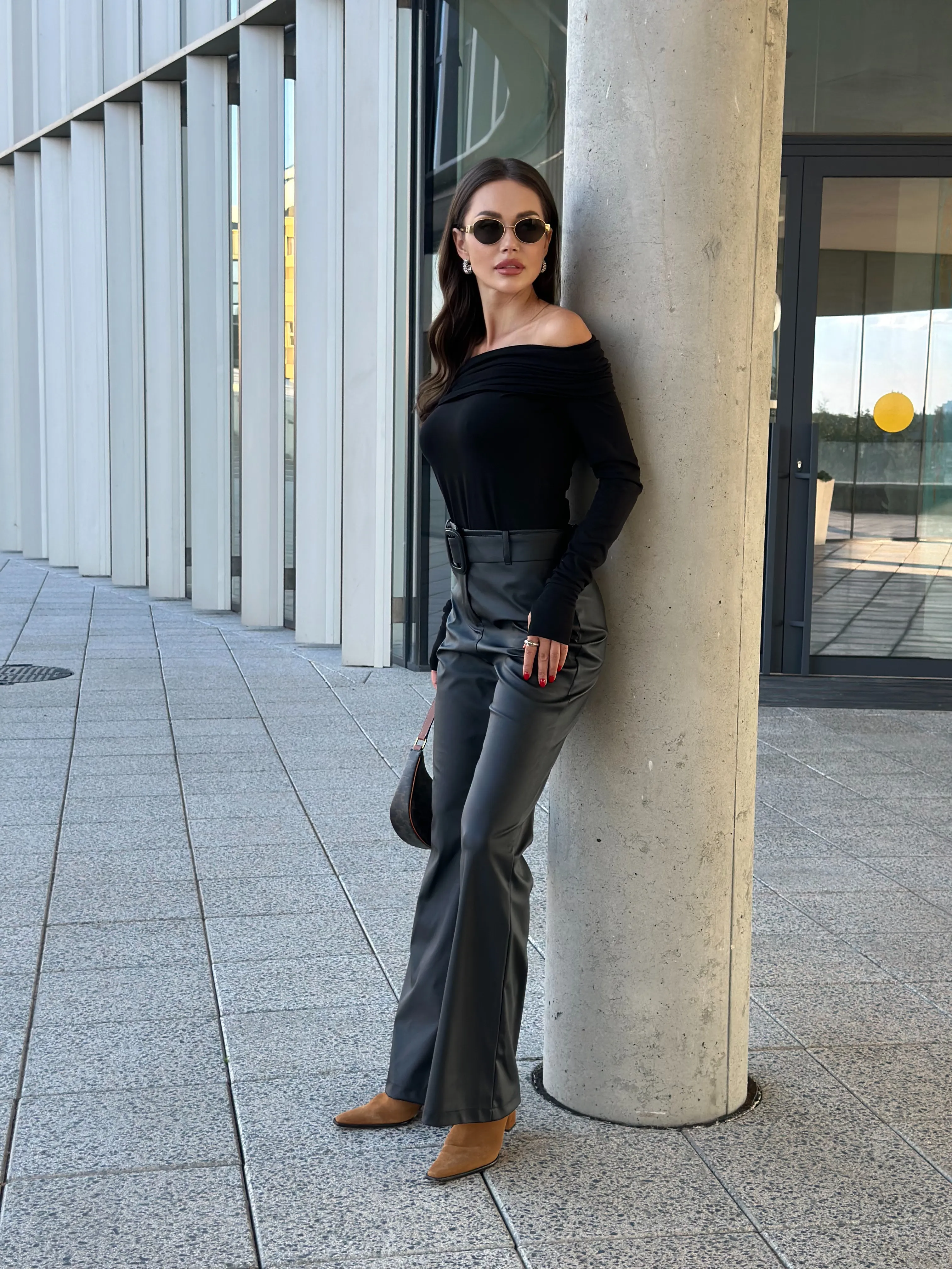 Джемпер выполнен из эластичного трикотажа средней плотности. Обработан воротником — хомут, который можно спустить ниже плеч. Рукава прилегающего силуэта, обработаны манжетой из основной ткани с вырезом для большого пальца.