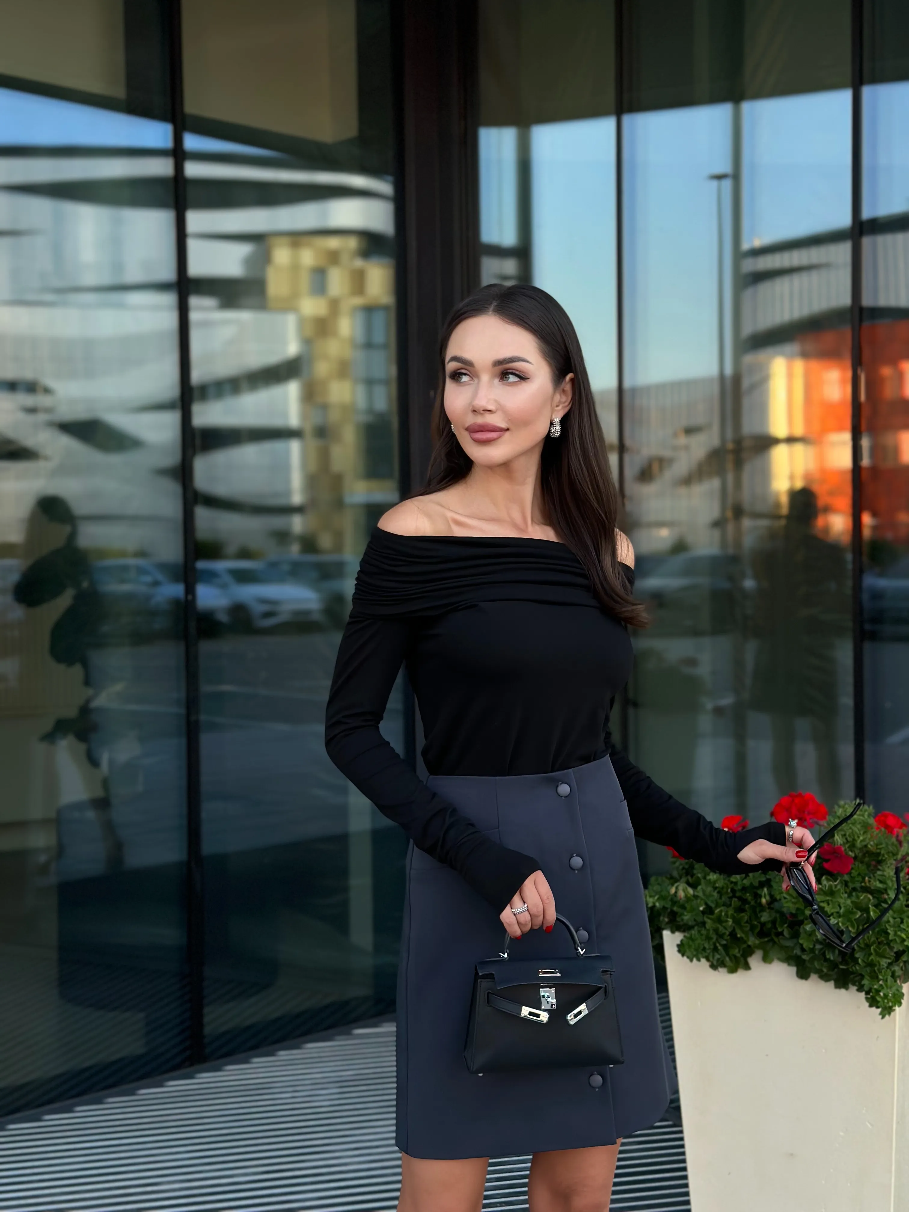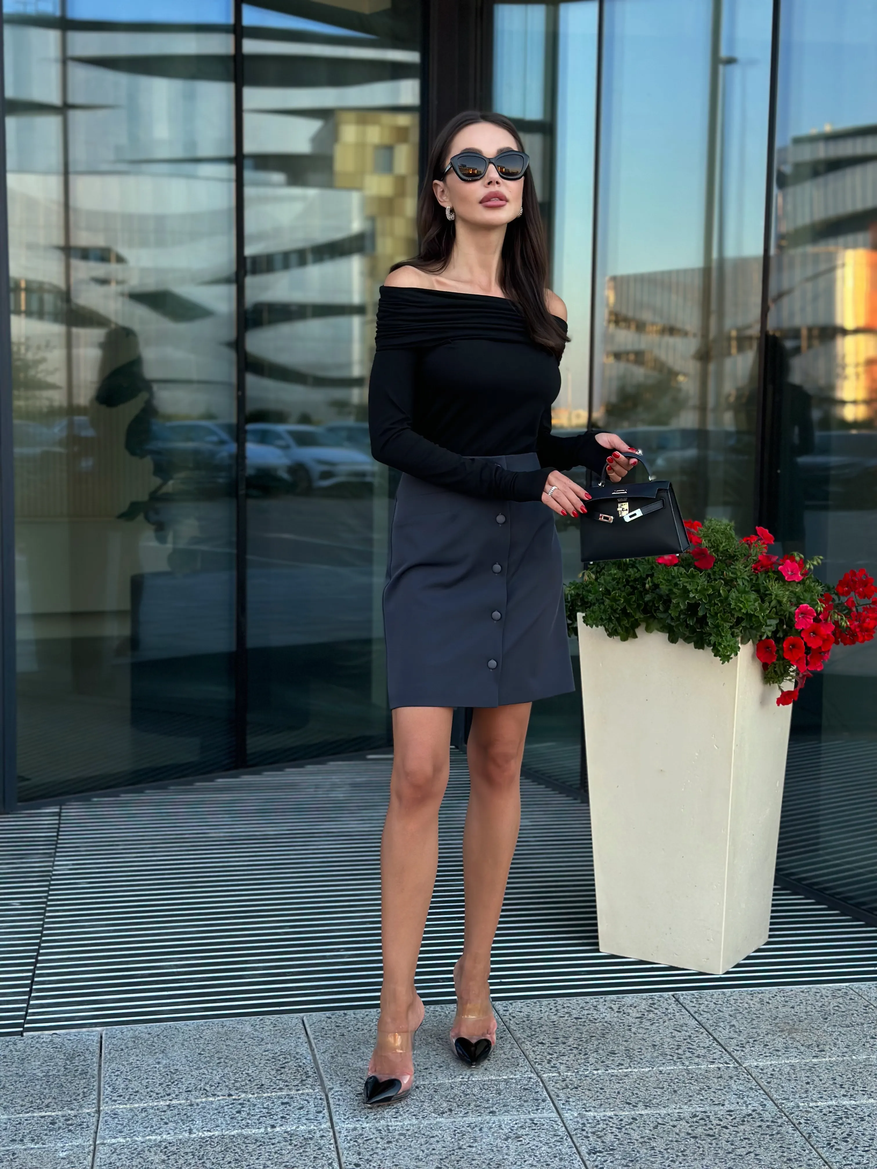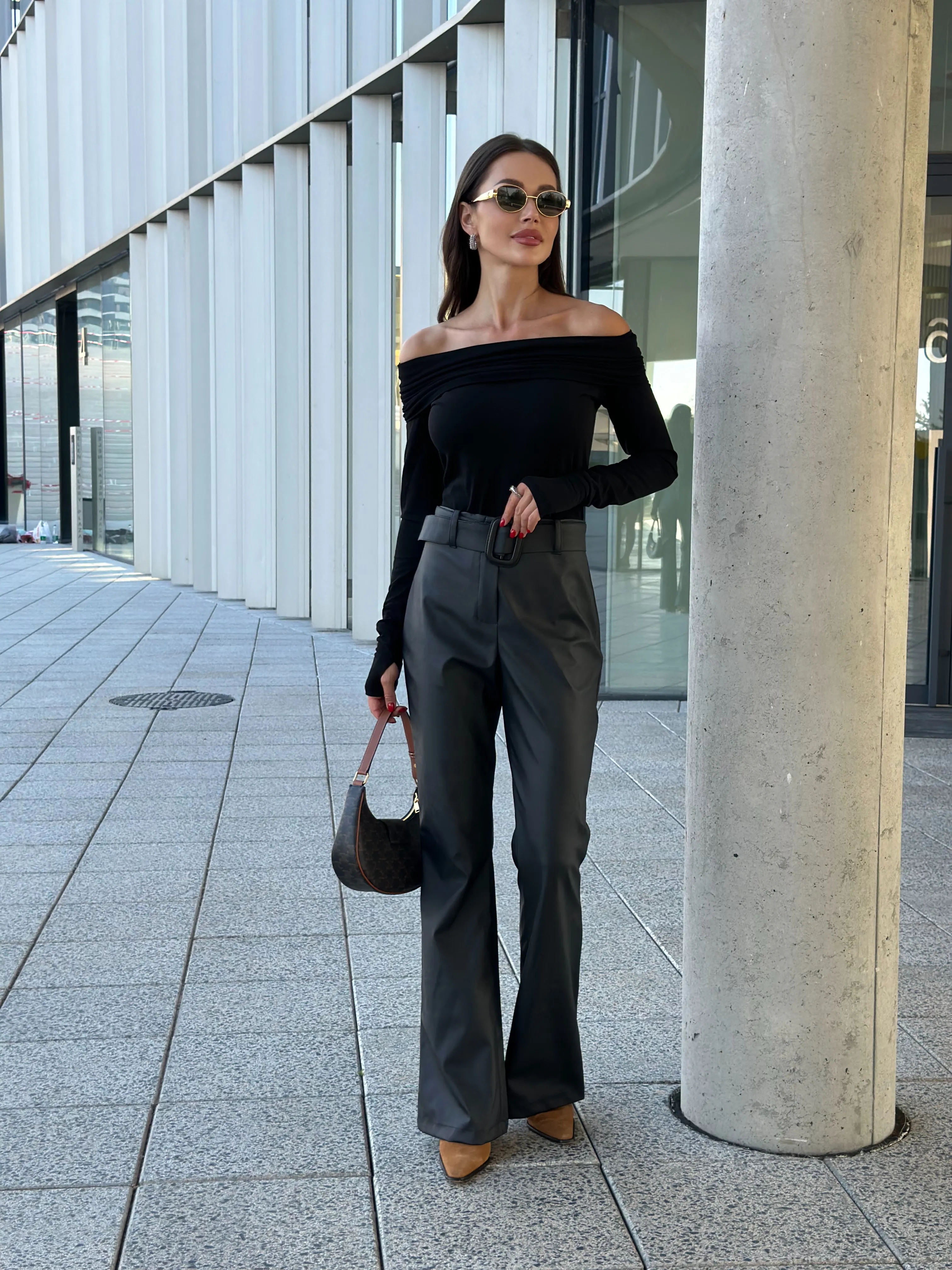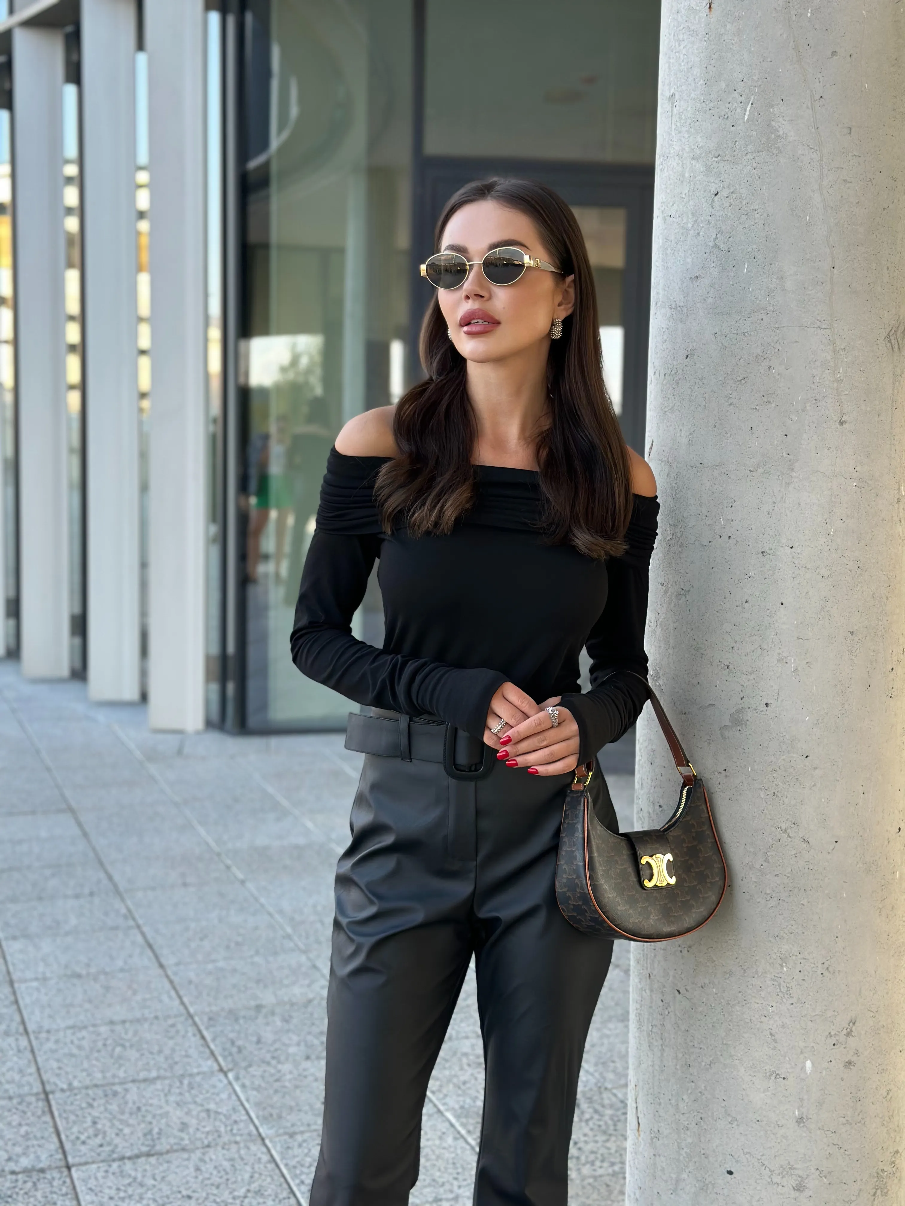Джемпер выполнен из эластичного трикотажа средней плотности. Обработан воротником — хомут, который можно спустить ниже плеч. Рукава прилегающего силуэта, обработаны манжетой из основной ткани с вырезом для большого пальца.