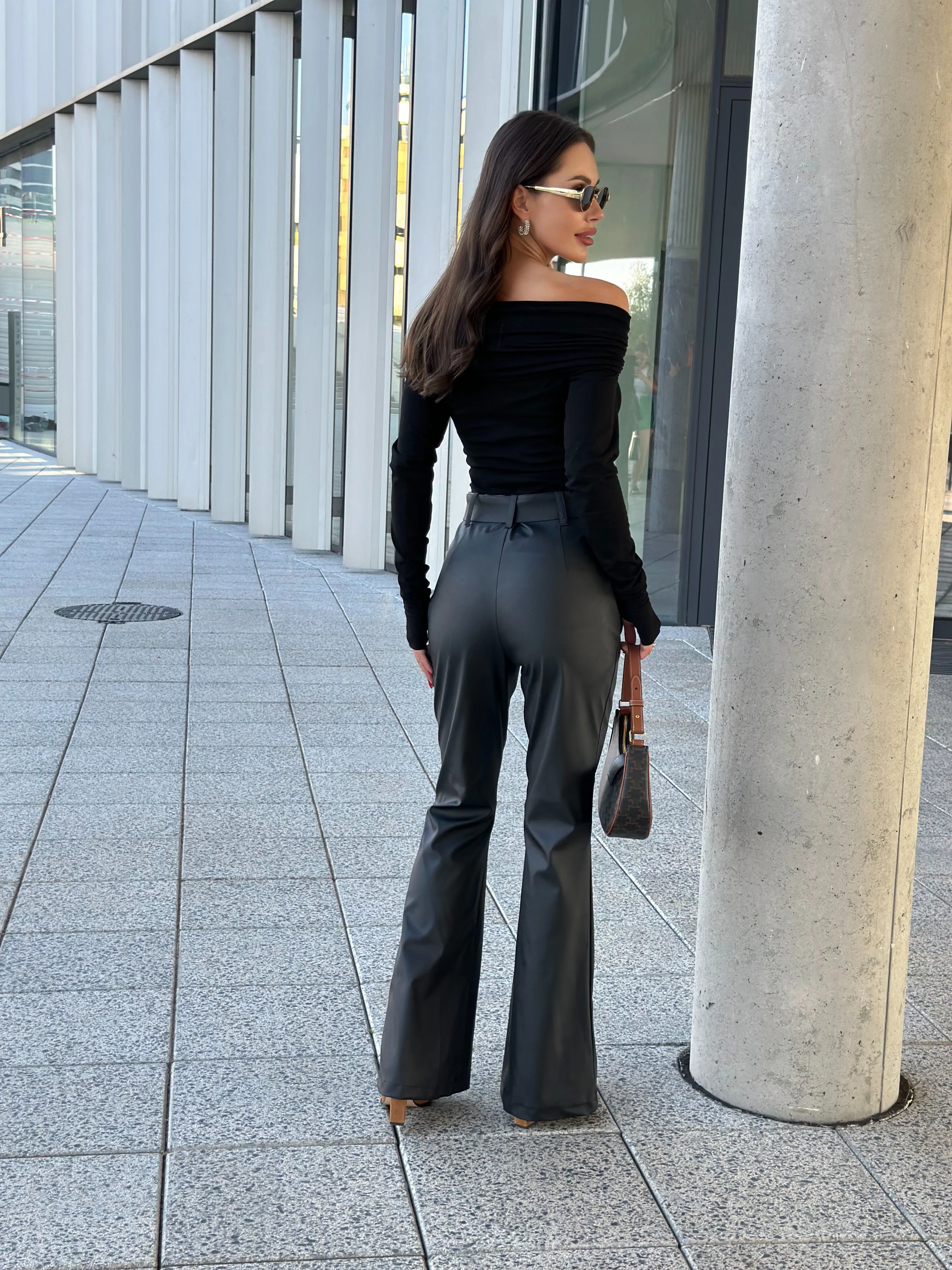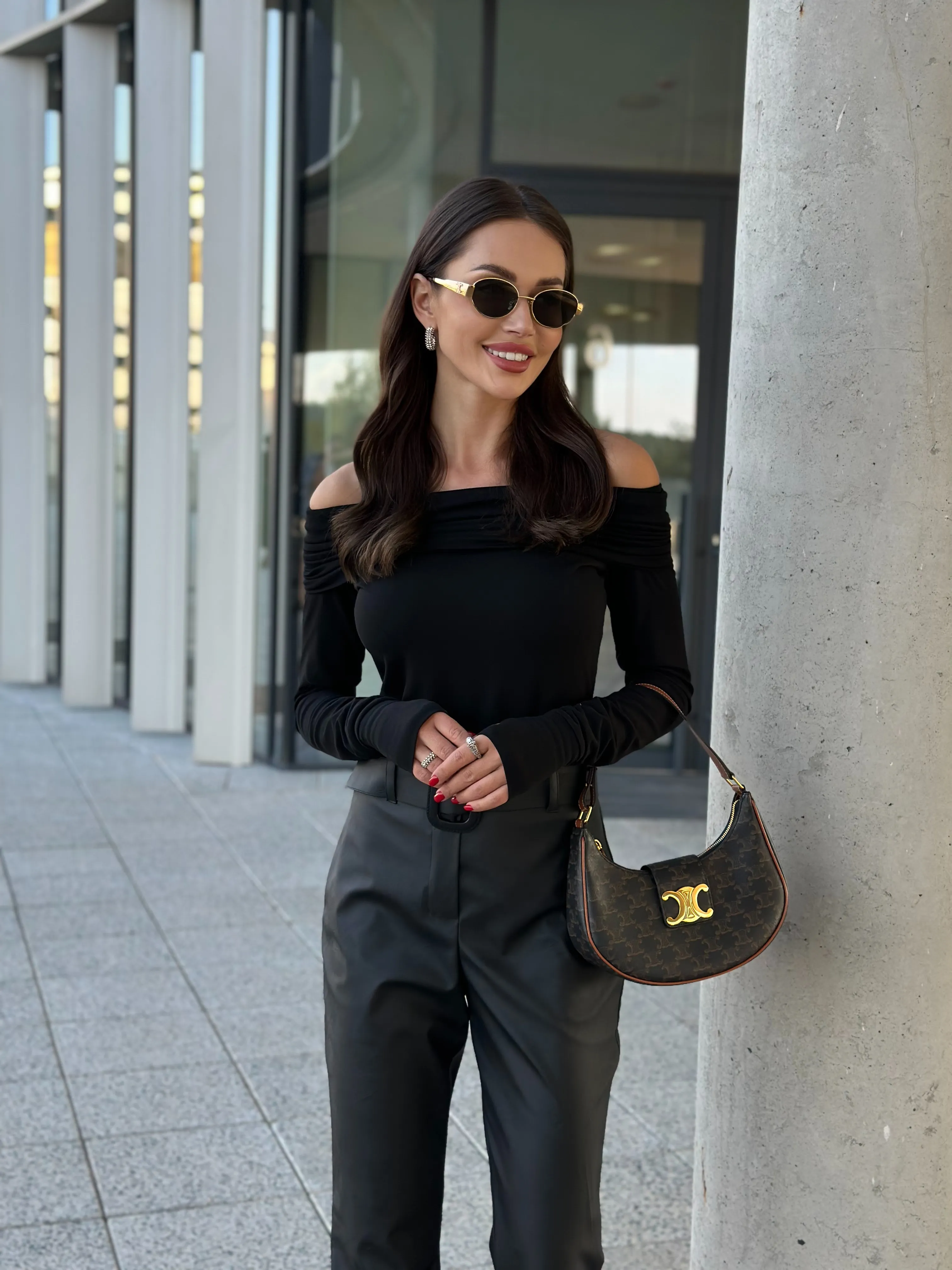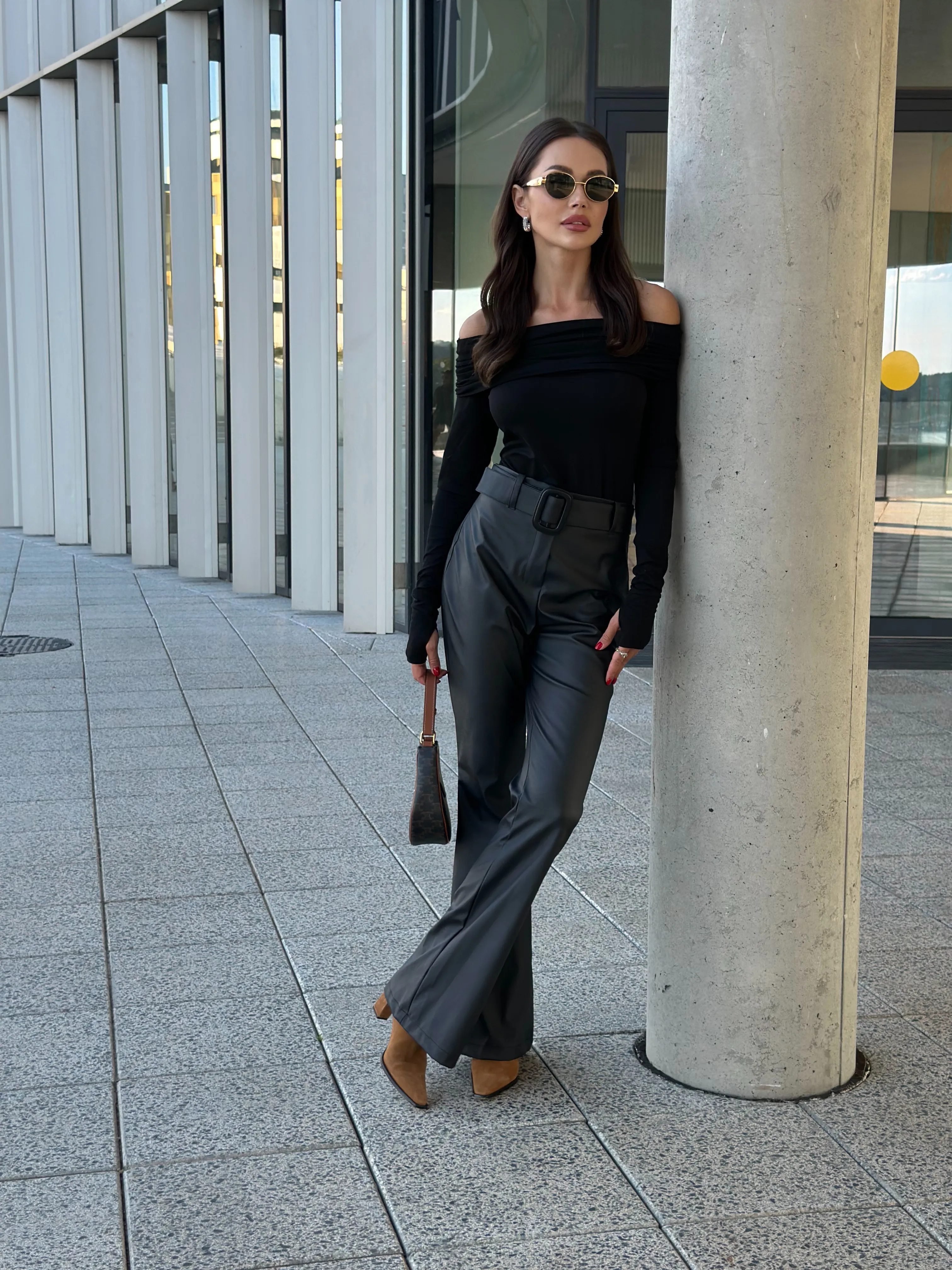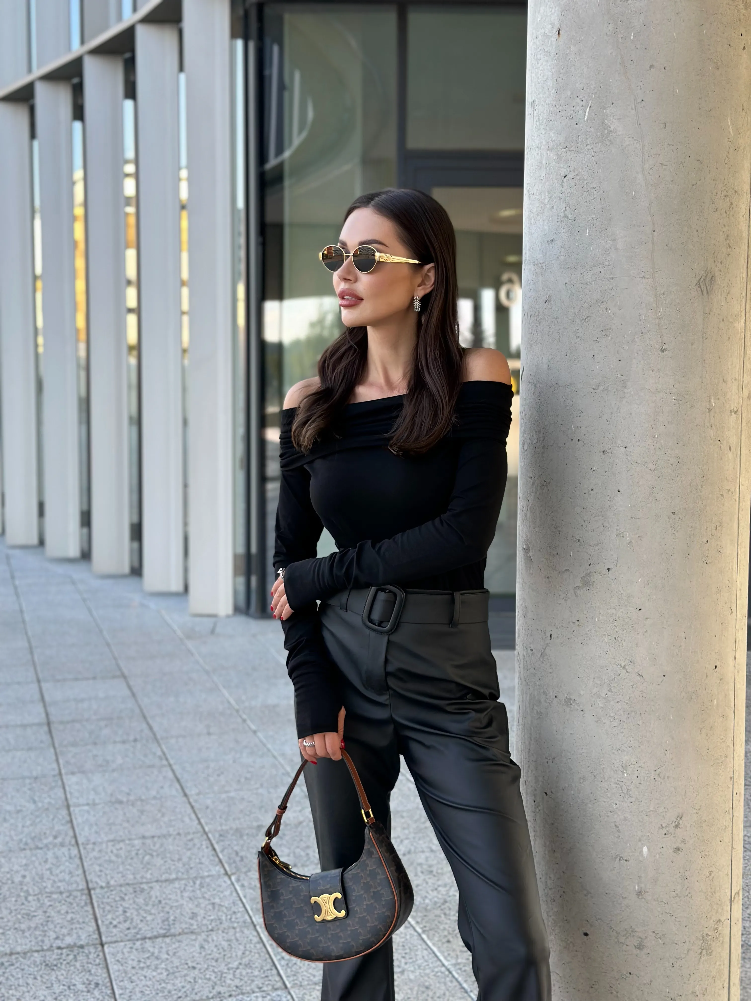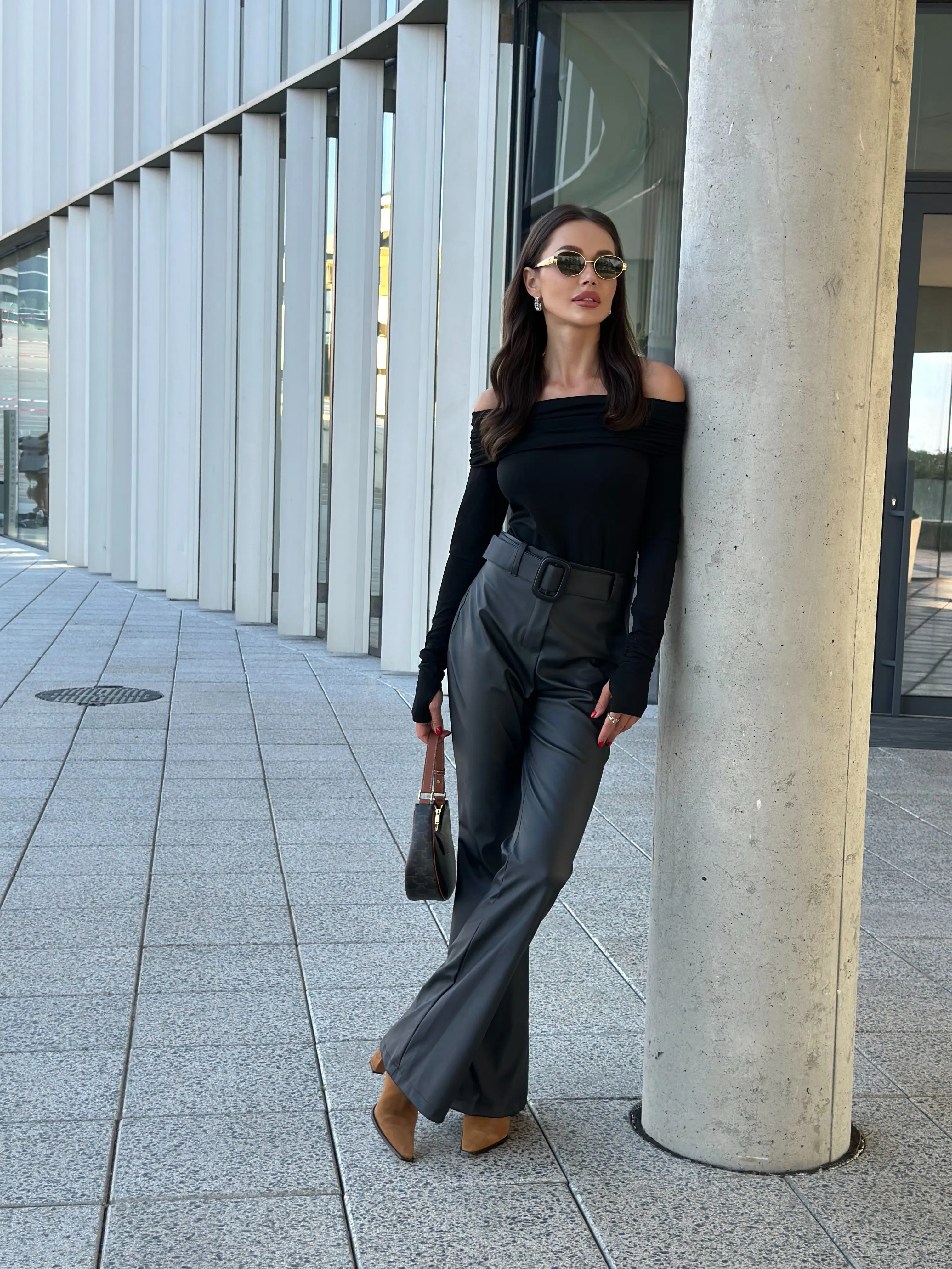 Джемпер выполнен из эластичного трикотажа средней плотности. Обработан воротником — хомут, который можно спустить ниже плеч. Рукава прилегающего силуэта, обработаны манжетой из основной ткани с вырезом для большого пальца.