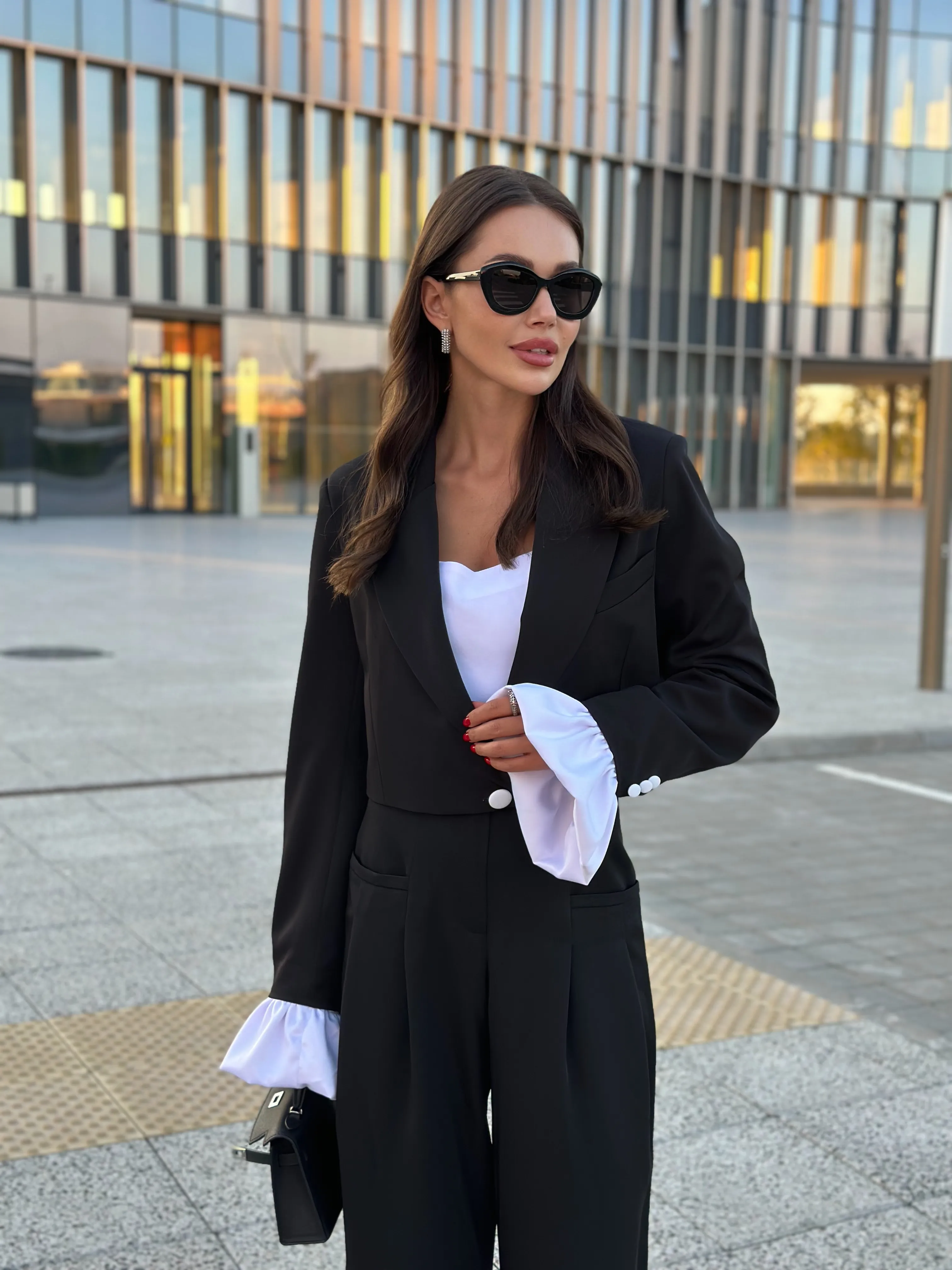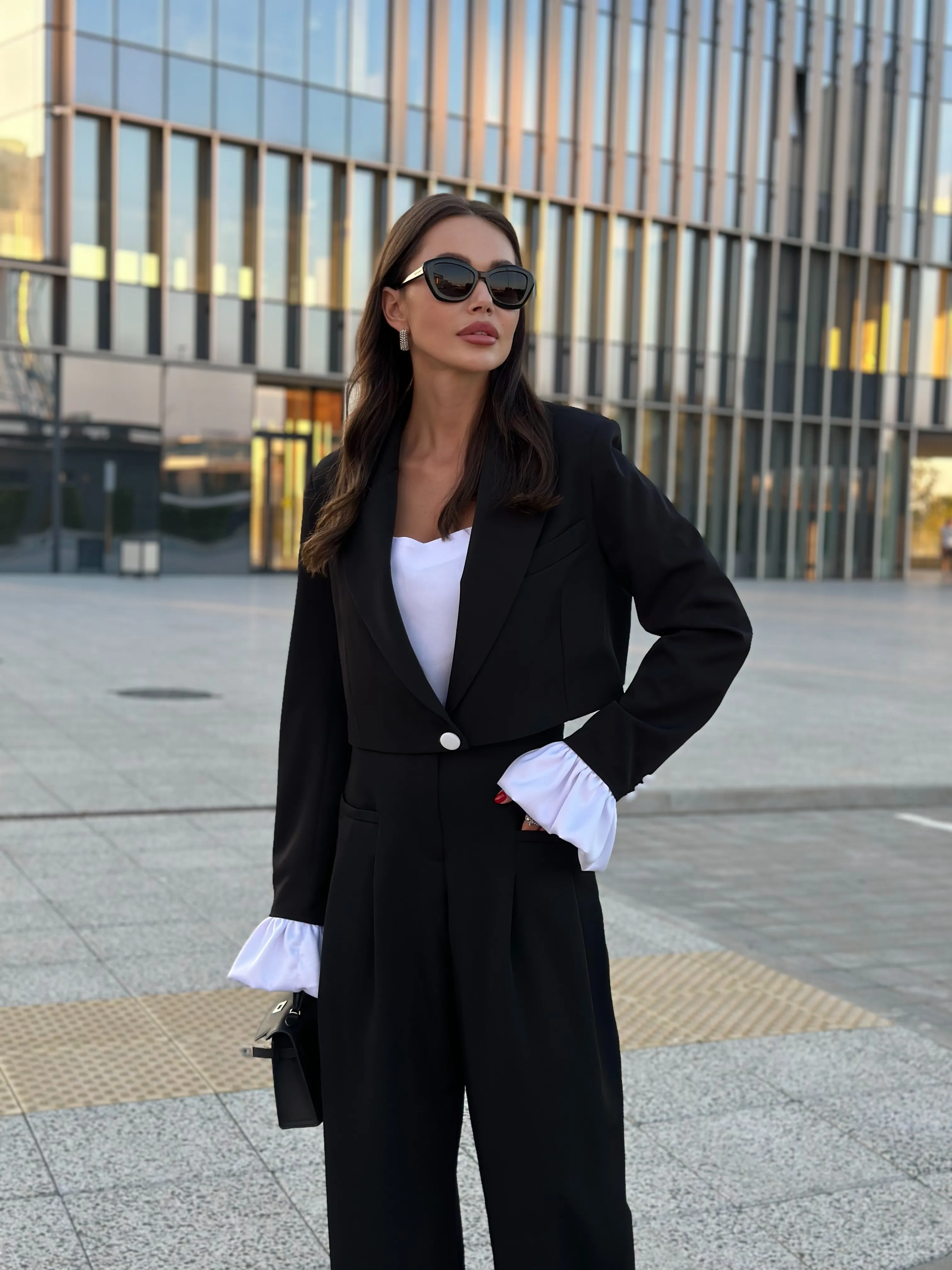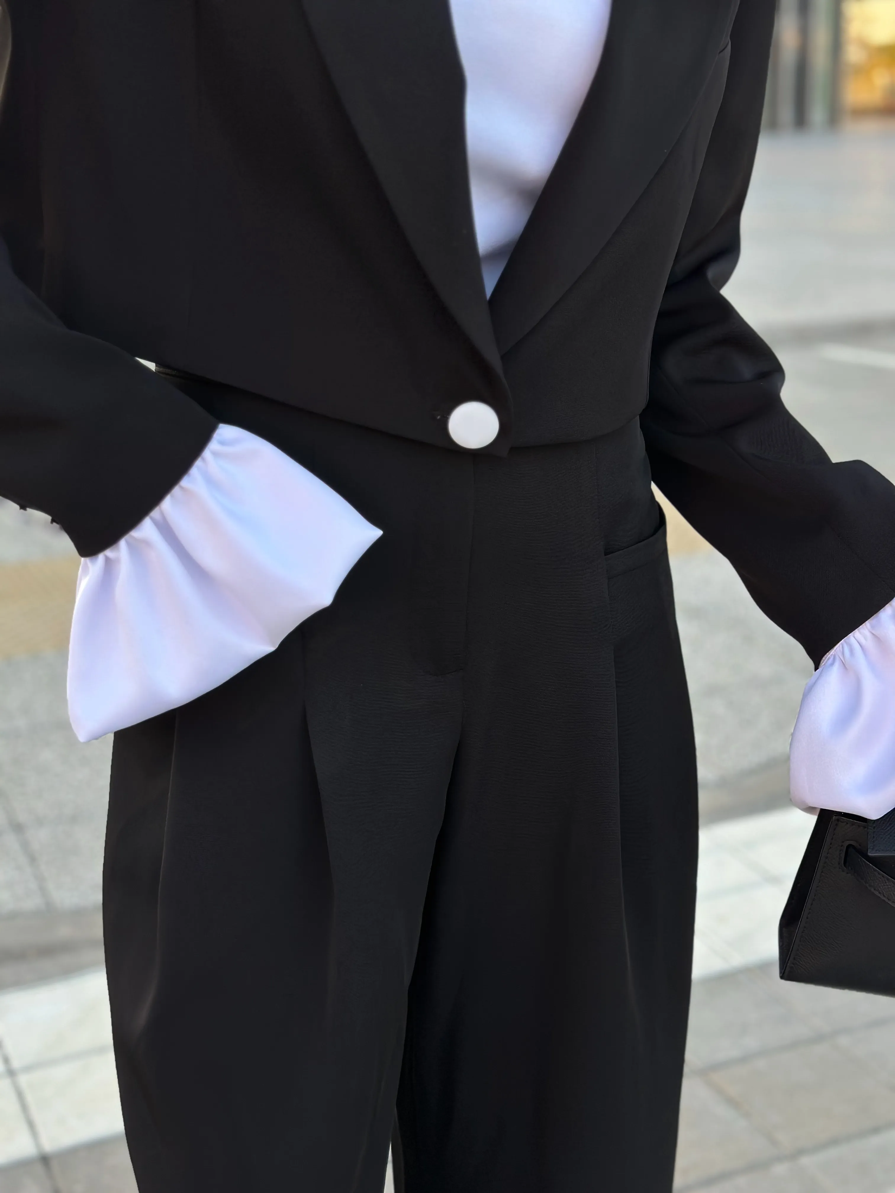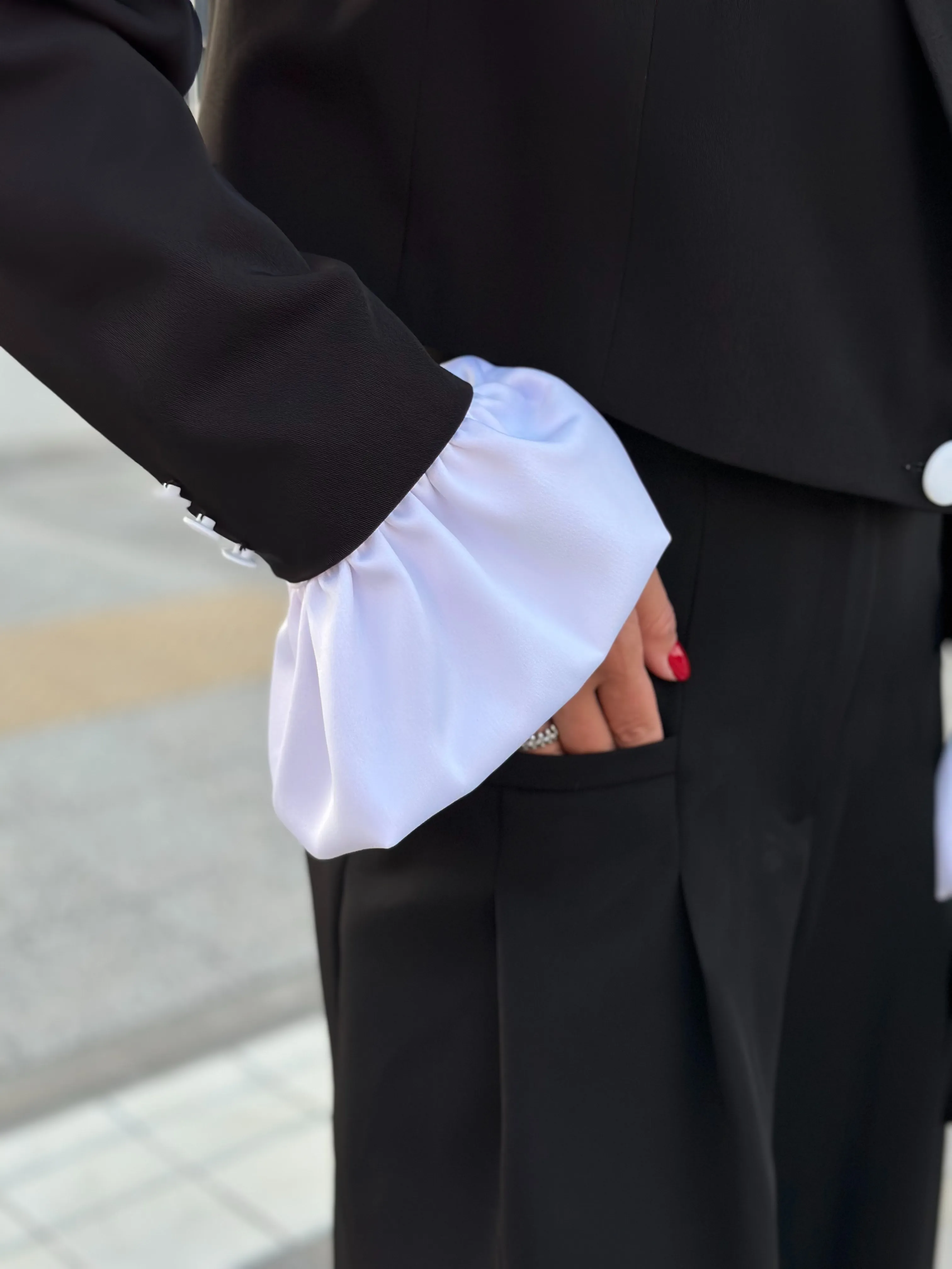 Однобортный жакет на подкладке, свободного силуэта. Рукава втачные одношовные, обработаны шлицей. Рукава комплектуются съёмными манжетами из атласной ткани, застёжка из изнаночной стороны на потайные пуговицы.