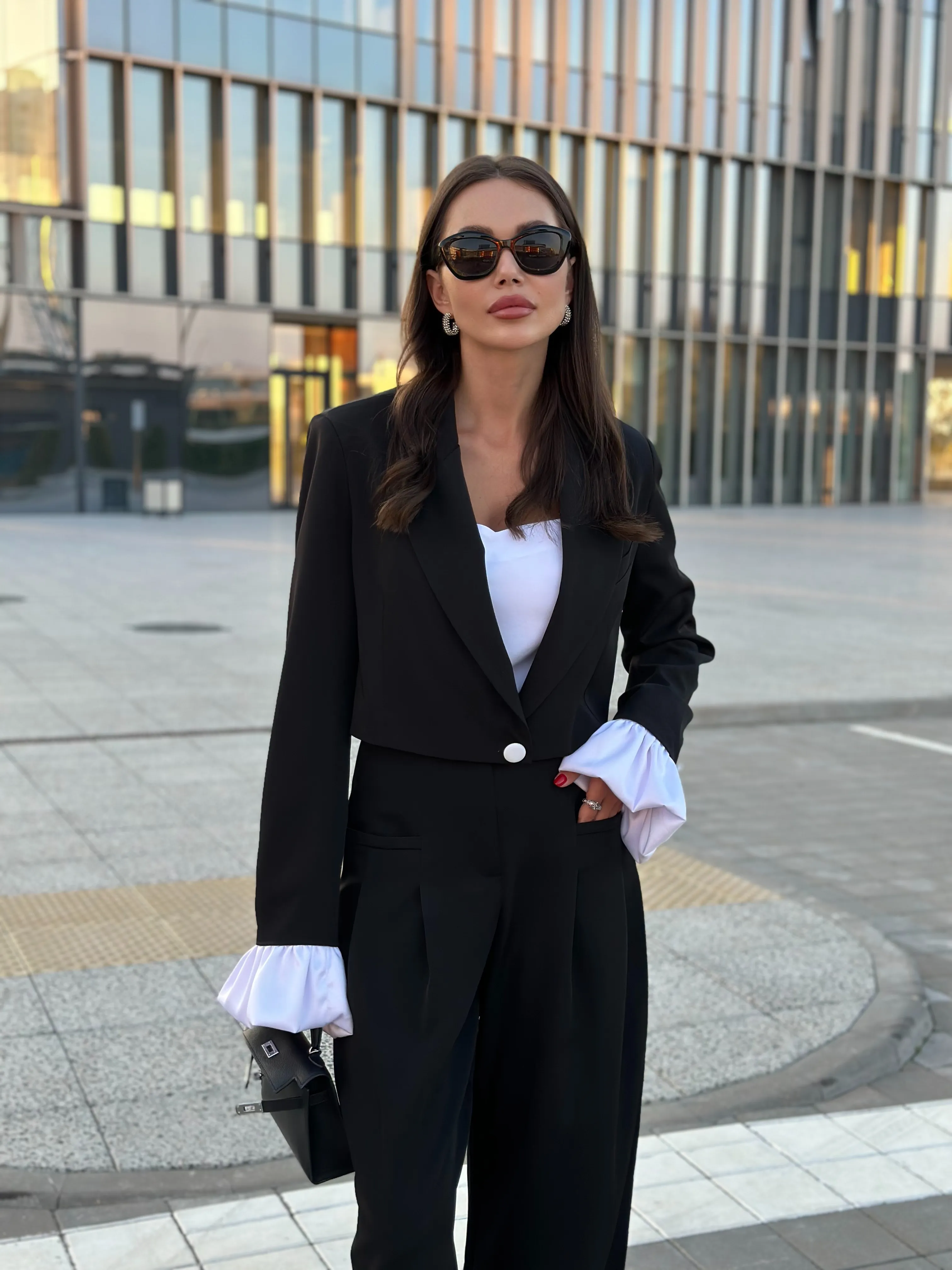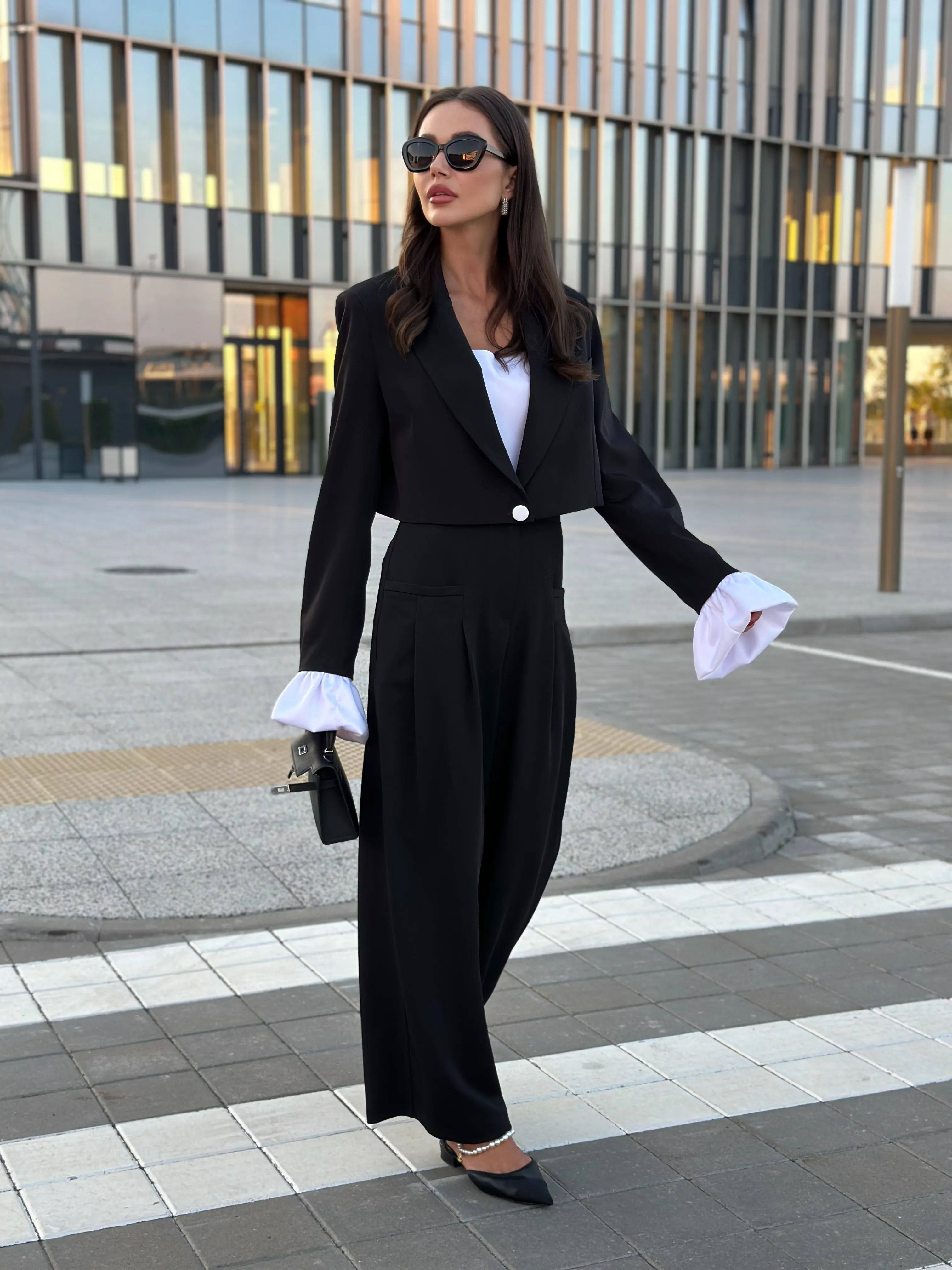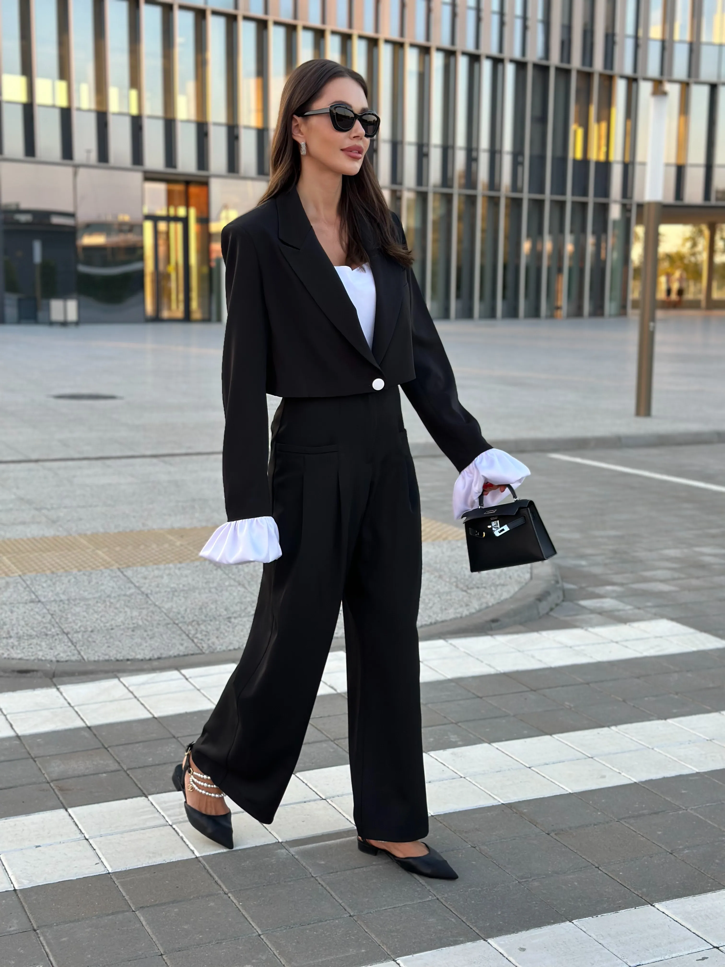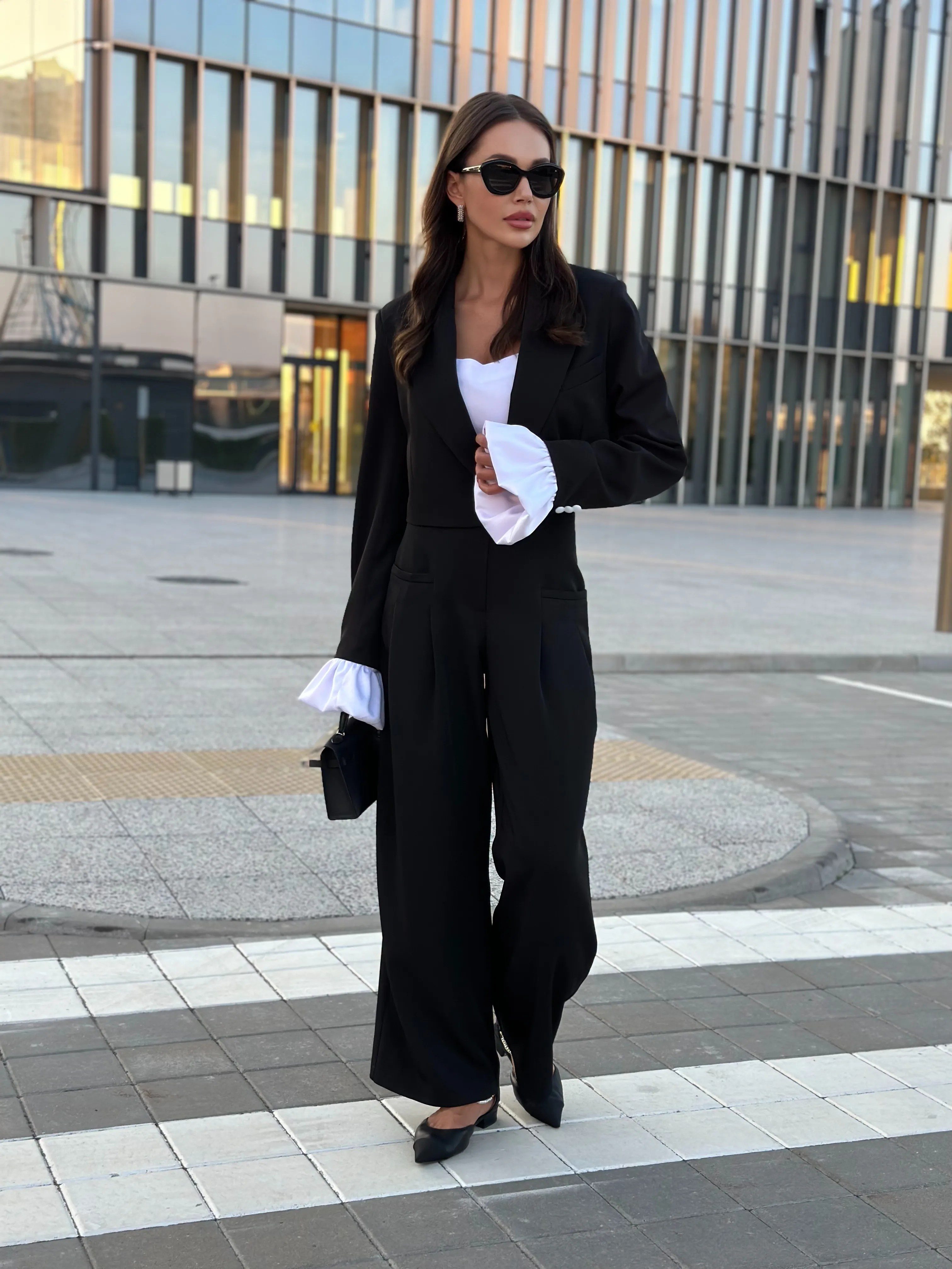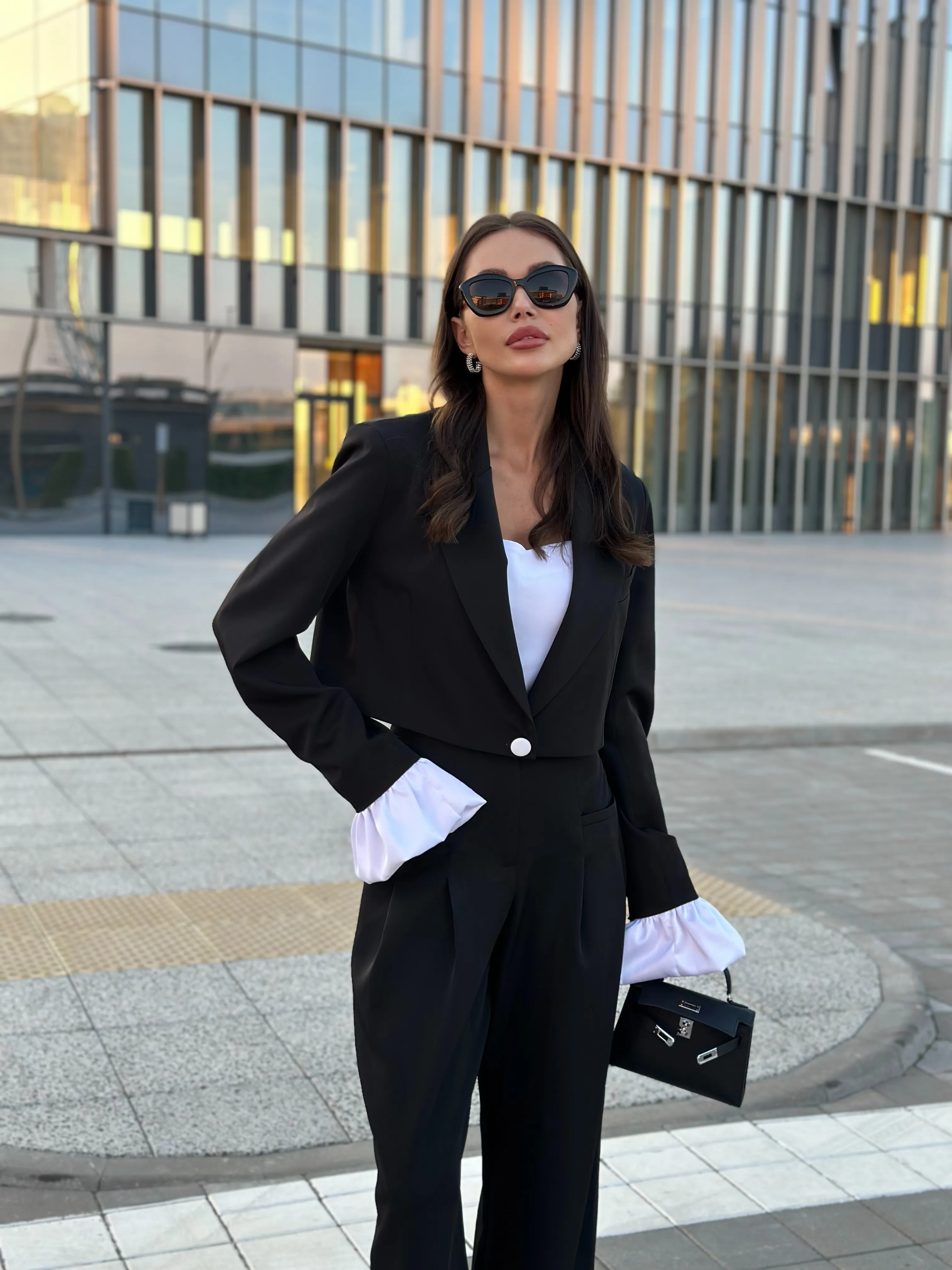 Однобортный жакет на подкладке, свободного силуэта. Рукава втачные одношовные, обработаны шлицей. Рукава комплектуются съёмными манжетами из атласной ткани, застёжка из изнаночной стороны на потайные пуговицы.