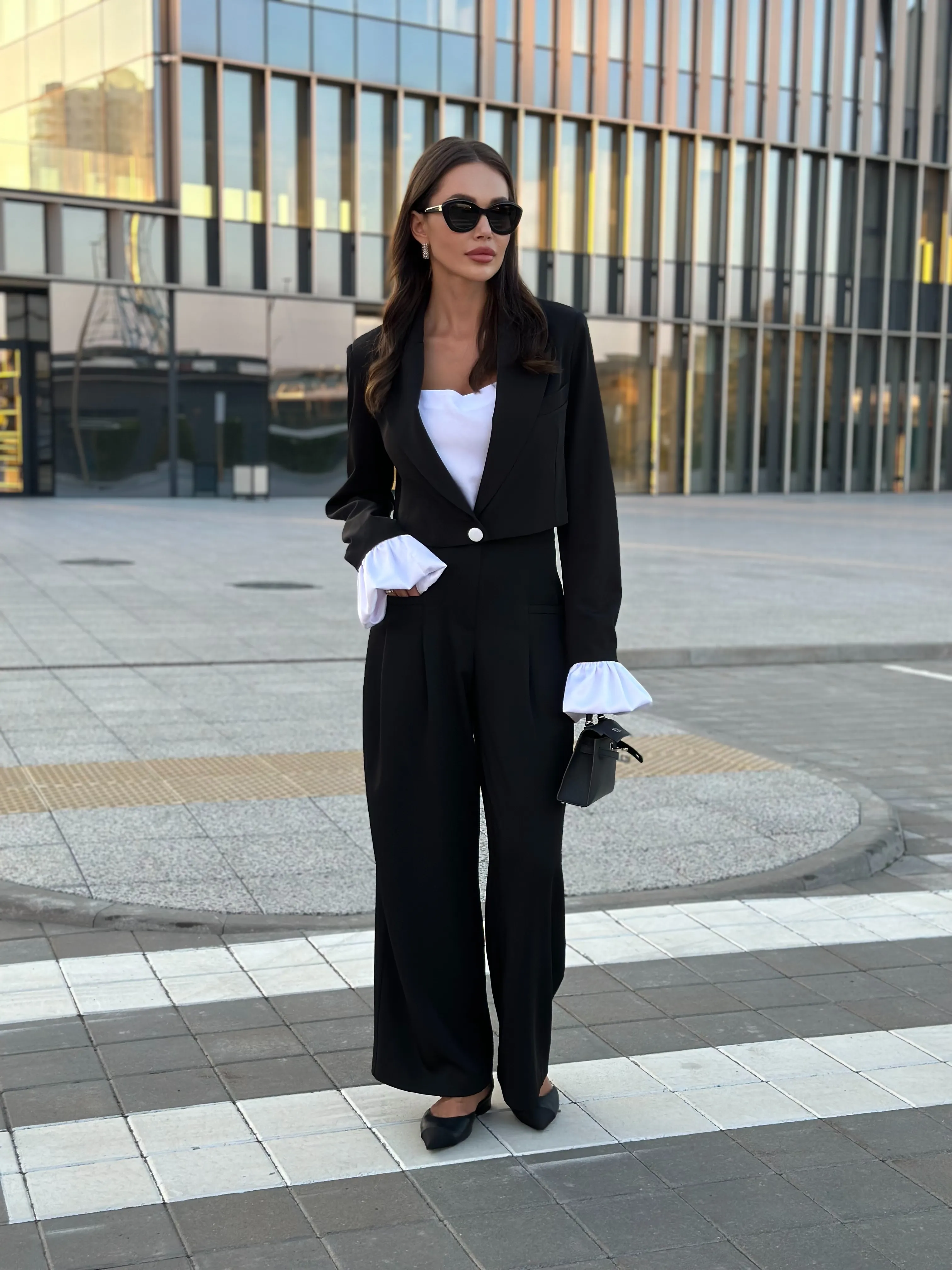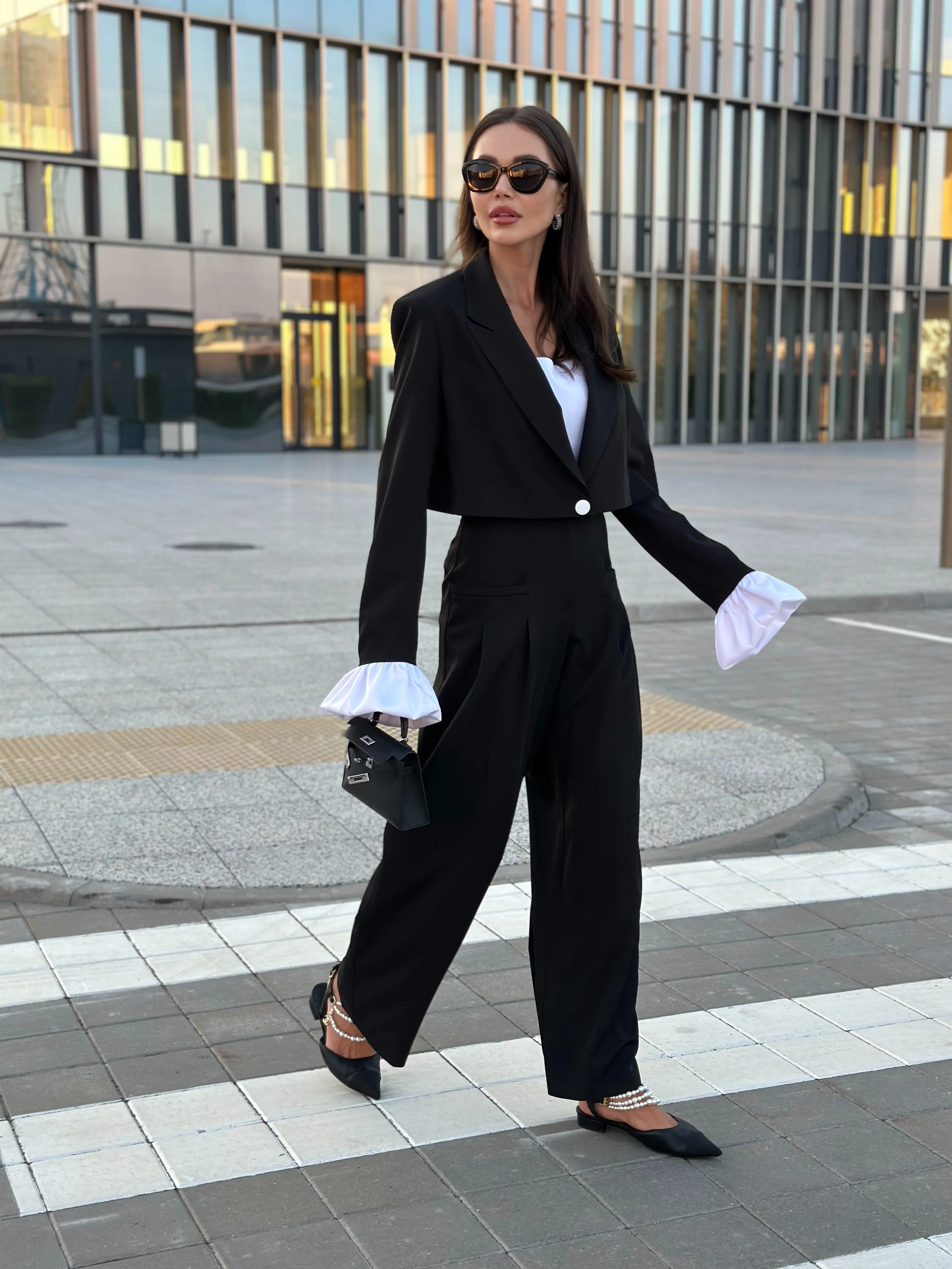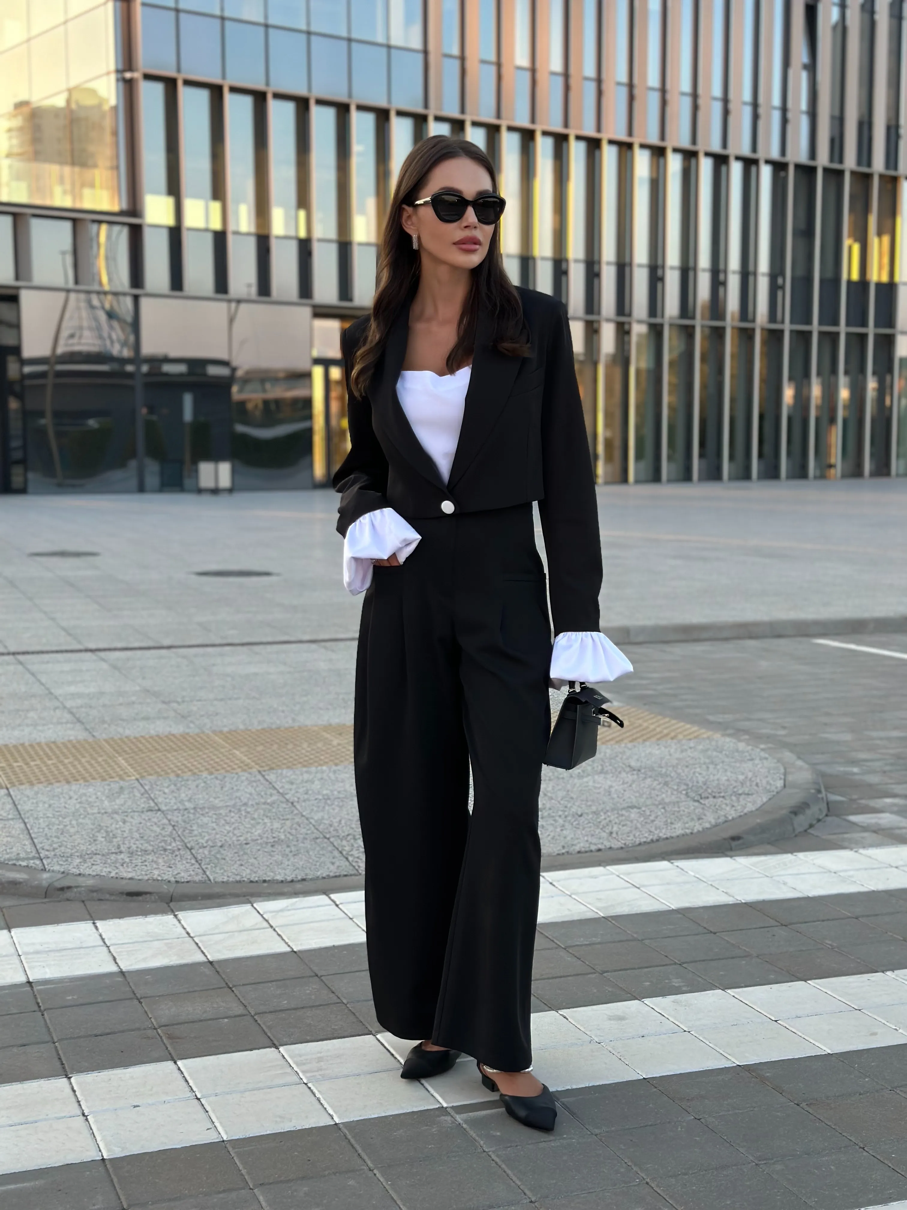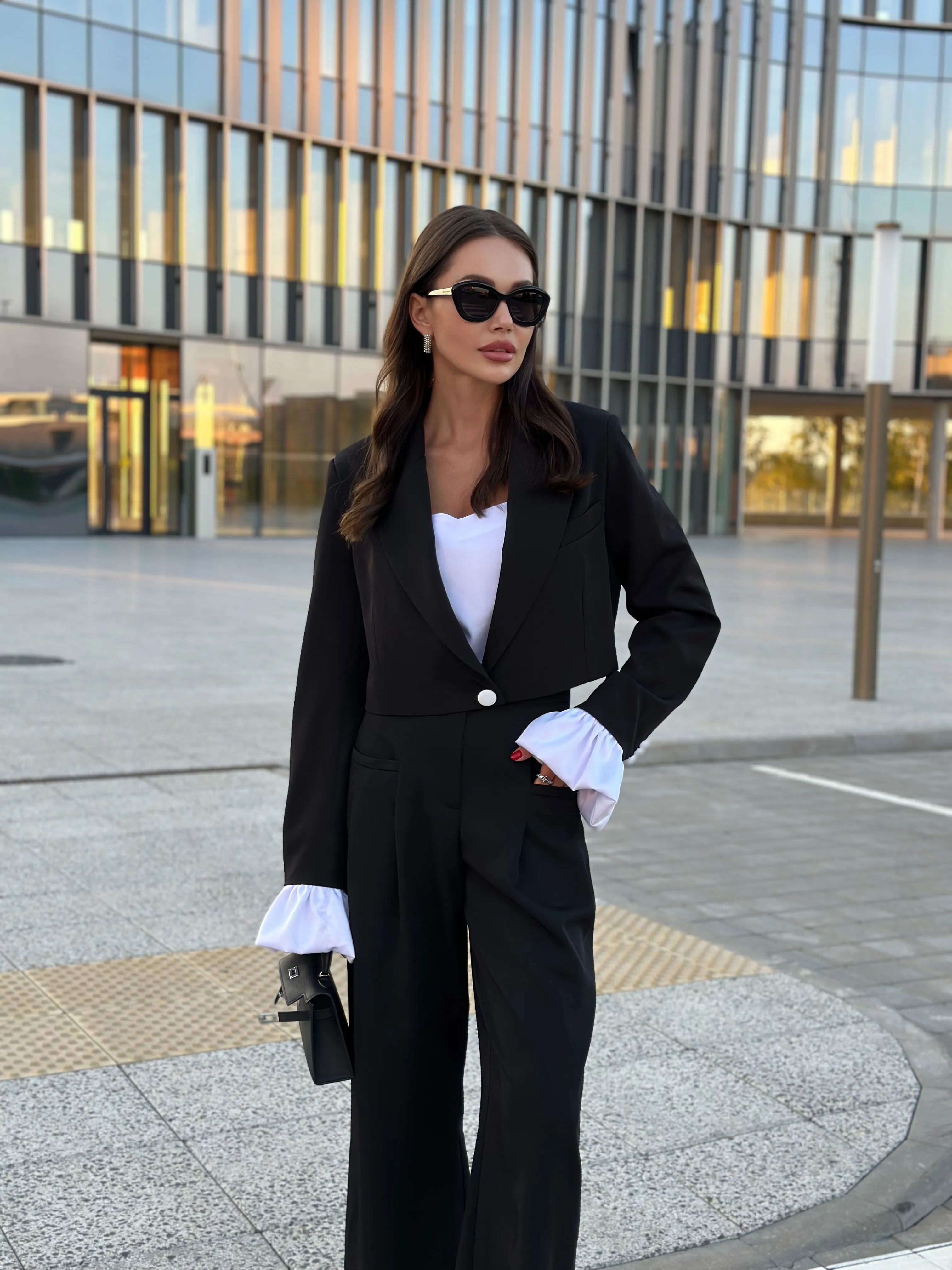 Однобортный жакет на подкладке, свободного силуэта. Рукава втачные одношовные, обработаны шлицей. Рукава комплектуются съёмными манжетами из атласной ткани, застёжка из изнаночной стороны на потайные пуговицы.