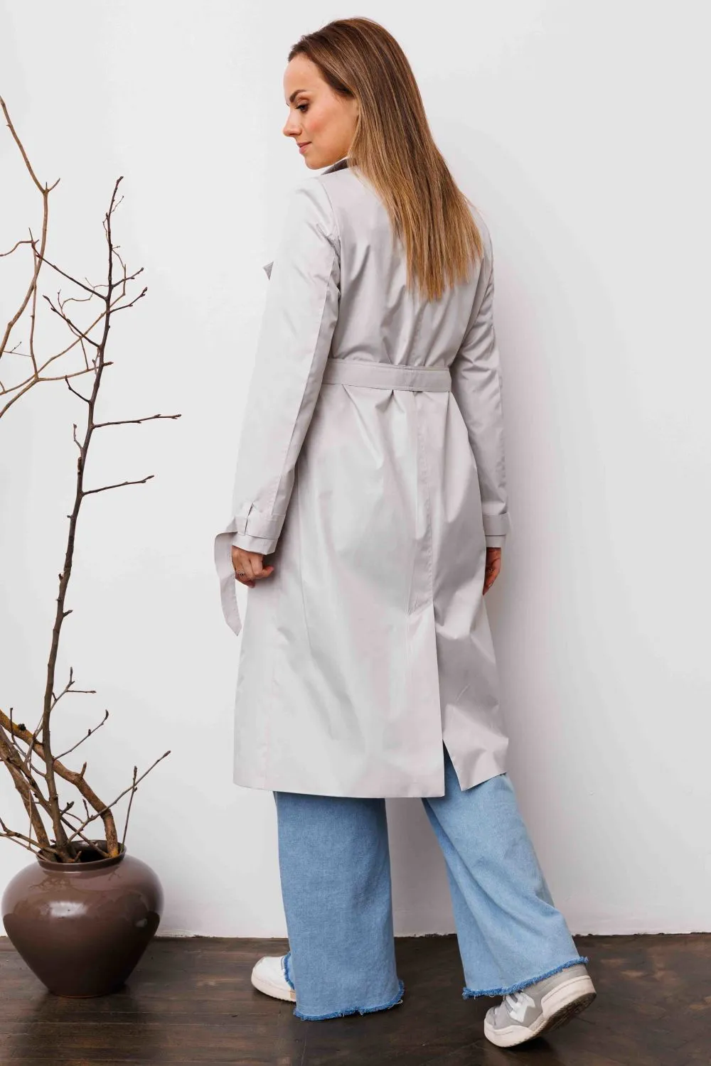 Плащ женский демисезонный, двубортный, прямого силуэта, из легкой плащевой ткани, на подкладке, двубортный, со съемным поясом из основной ткани и шлёвками. Плащ предназначен для повседневной носки.