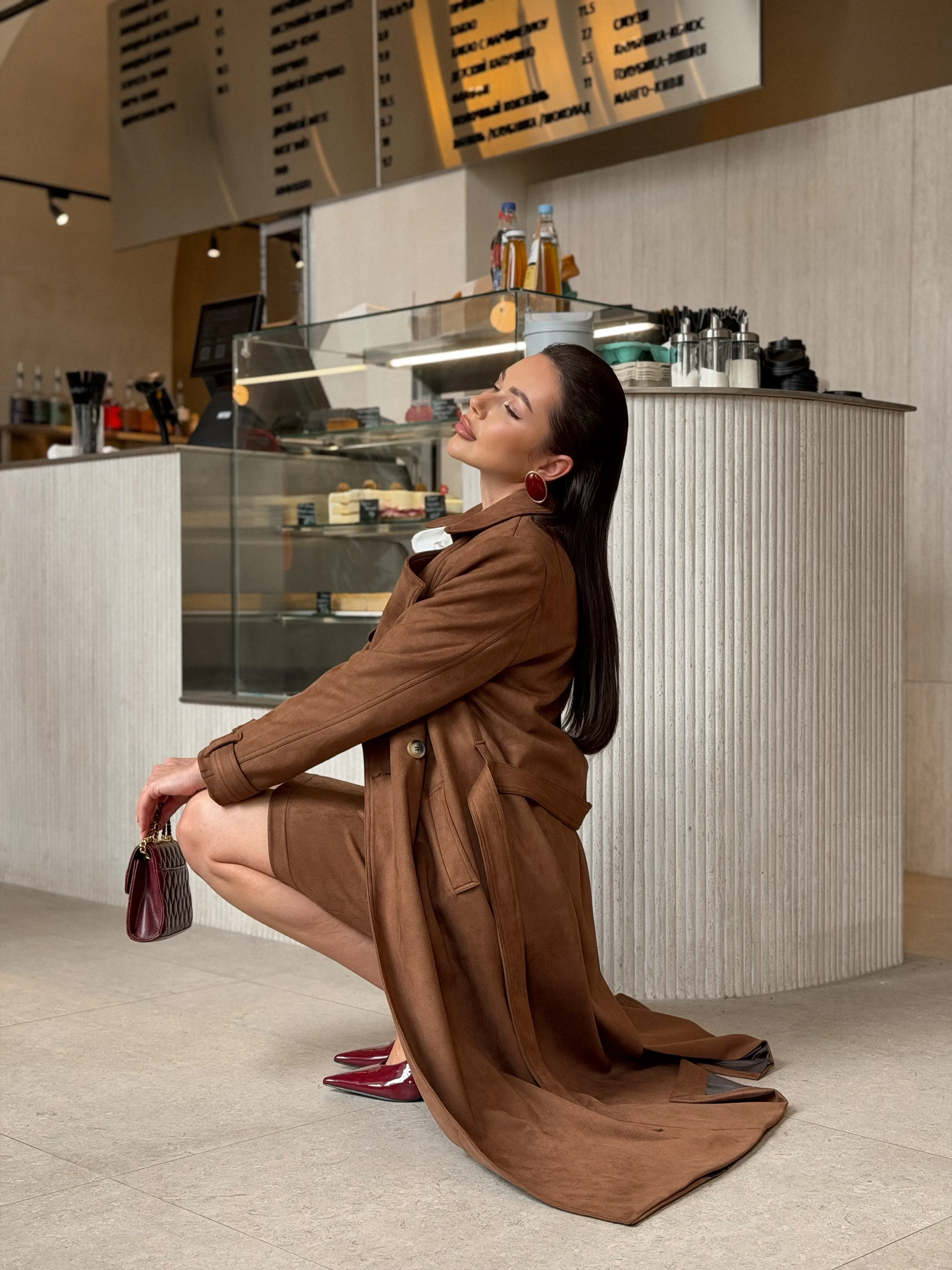 Тренч женский демисезонный, двубортный, удлинённого прямого силуэта, из замшевой ткани, на подкладке, двубортный, со съемным поясом из основной ткани и шлёвками. Плащ предназначен для повседневной носки.